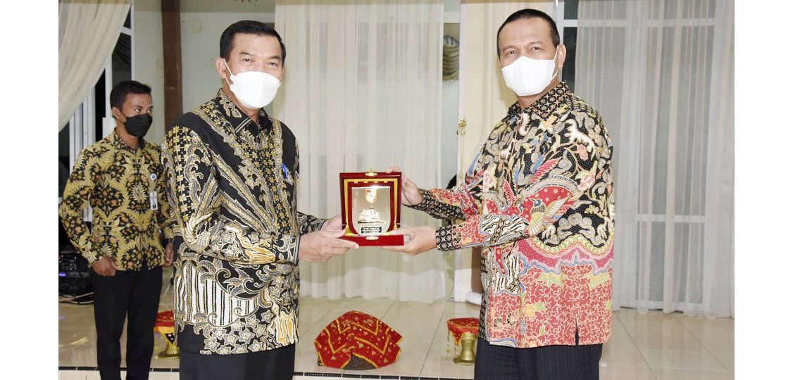 BERTUKAR CENDERA MATA— Wali Kota Pekanbaru, Firdaus saling bertukar cendera mata dengan Wali Kota Pariaman, Genius Umar.