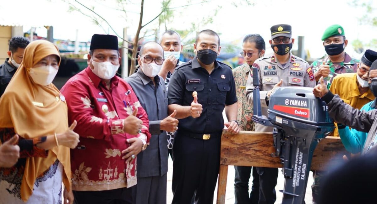 PDG.PARIAMAN, METRO–Bupati Padangpariaman Suhatri Bur, kemarin, mendampingi Wakil Gubernur (Wagub) Sumatera Barat Audy Joinaldy dalam penyerahan paket bantuan mesin tempel 15 PK kepada kelompok nelayan Katapiang di Nagari Katapiang Kecamatan Batang Anai.
