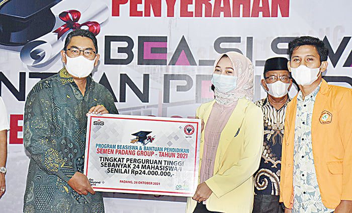 PENYERAHAN BEASISWA— Direktur Utama PT Semen Padang Yosviandri menyerahkan beasiswa kepada perwakilan mahasiswa dalam acara yang dilaksanakan di GSG PT Semen Padang, Selasa (26/10/2021) lalu. Pada acara itu PT Semen Padang menyalurkan beasiswa kepada 738 pelajar, mahasiswa dan atlet berprestasi.