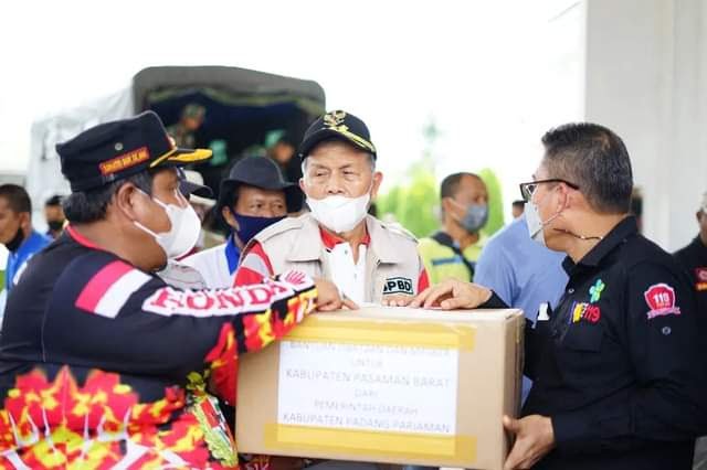SERAHKAN BANTUAN—Bupati Padangpariaman Suhatri Bur serahkan bantuan korban gempa di Pasaman Barat dan Pasaman.