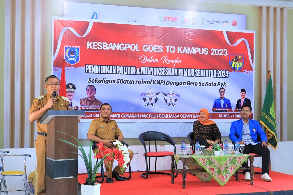 SUKARNOHATTA, METRO–Penjabat Wali Kota Payakumbuh Rida Ananda membuka Kesbangpol Goes To Kampus dalam rangka Pendidikan Politik dan Menyukseskan Pemilu Serentak 2024 yang digelar di Universitas Muhammadiyah Sumatera Barat Kota Payakumbuh, baru-baru ini. Kegiatan ini diikuti oleh sekitar 100 orang mahasiswa dari seluruh kampus yang ada di Kota Payakumbuh dan KNPI, dihadiri juga oleh Rektor UMSB Sumbar Riki Saputra yang diwakili Dekan UM Sumbar.