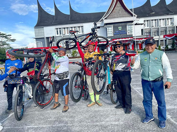 PDG. PARIAMAN, METRO–Memeriahkan Hari Ulang Tahun (HUT) RI ke 78 tahun 2023, Pemkab Padangpariaman bersama masyarakat pecinta sepeda melaksanakan keliling Kabupaten Padangpariaman. Starnya dari Kantor Bupati Padangpariaman menuju Pantai Tiram.