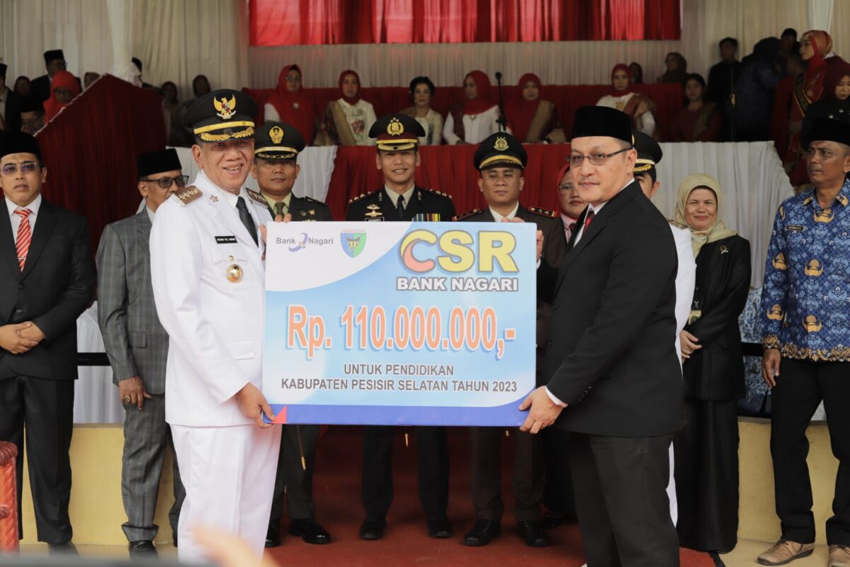 Penyerahan dana dana Corporate Social Responsibility (CSR) Pendidikan, diserahkan Bank Nagari Cabang Painan pada upacara peringatan Hari Ulang Tahun (HUT) Kemerdekaan RI ke -78. Kamis (17/8/2023) di Gor H. Ilyas Yakub Rawang Painan.