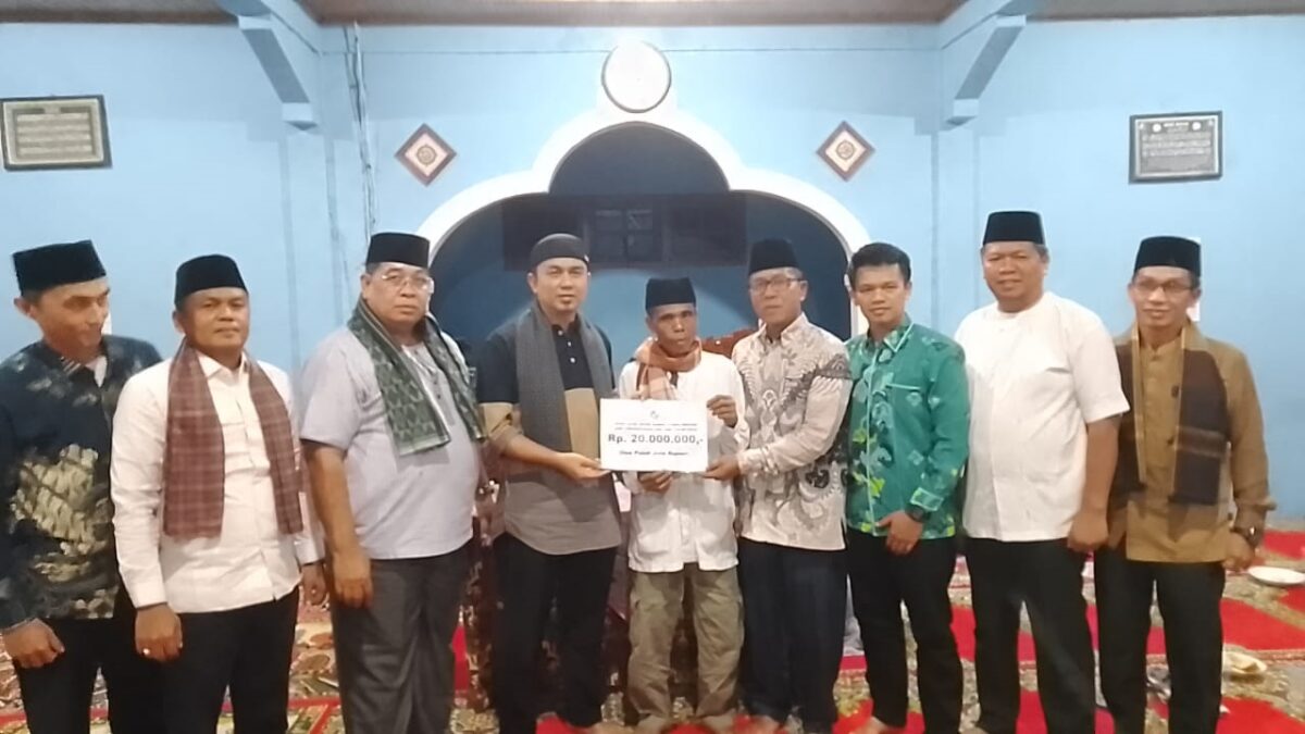 SERAHKAN BANTUAN— Ketua DPRD Limapuluh Kota, Deni Asra menyerahkan bantuan kepada pengurus masjid.