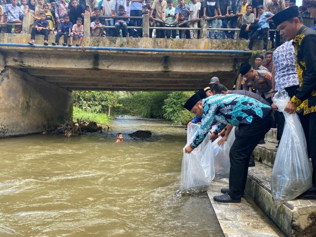 SIJUNJUNG, METRO–Bupati Kabupaten Sijunjung Benny Dwifa Yuswir lepas sebanyak 10.000 benih ikan nila di aliran sungai batang pulasan Nagari Pulasan, Kecamatan Tanjung Gadang,Kamis (2/5).