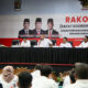 DAMPINGI—Ketua KPU Lima Puluh Kota, Okto Rizaldi didampingi Komisioner lainnya dan Sekretaris KPU saat melakukan konferensi pers.