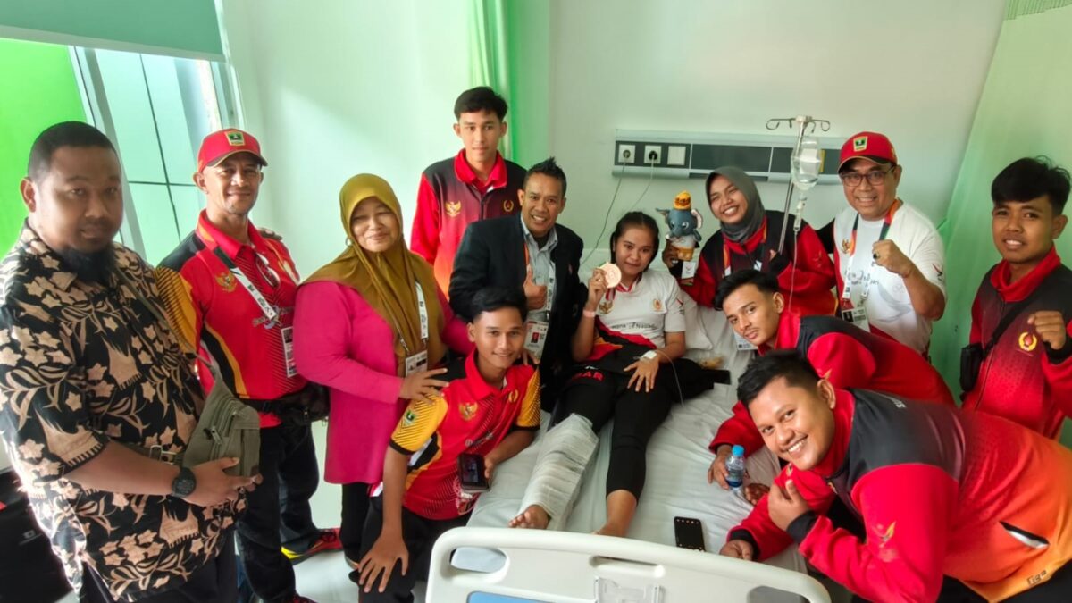 ACEH, METRO–Ketua Umum Komite Olahraga Nasional  (KONI) Sumbar, Ronny “Ompa” Pahlawan menjenguk se­kaligus memberikan motivasi kepada atlet Hapkido putri Sumbar yang menga­lami cedera patah tulang kaki saat bertanding.