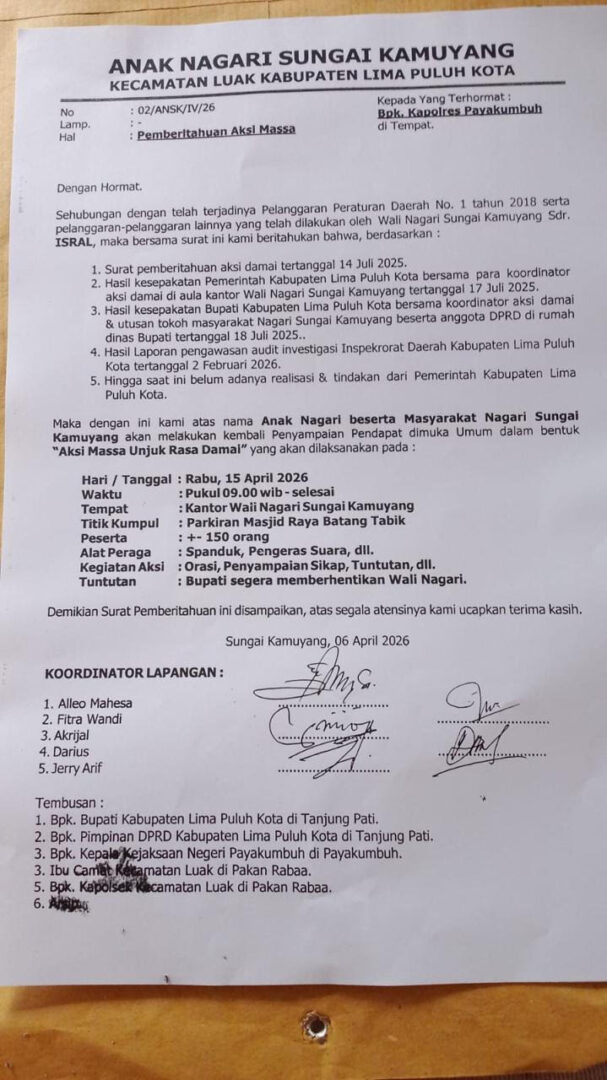 Aksi massa yang akan diikuti berbagai unsur itu, direncanakan akan digelar Rabu (15/4), sekitar pukul 09.00 Wib di Kantor Walinagari Sungai Kamuyang di Jalan Raya Payakumbuh-Lintau. Dalam surat pemberitahuan yang disampaikan kepada Polres Payakumbuh tanggal 6 April 2026 itu, massa akan menyampaikan sejumlah hal, terutama meminta Bupati untuk segera memberhentikan Walinagari.