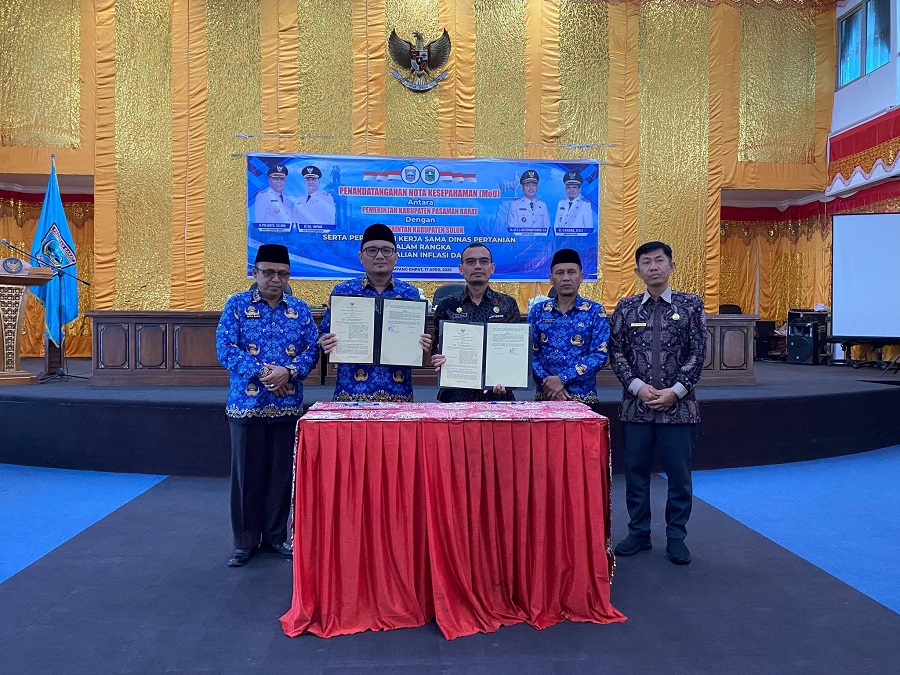 PASBAR, METRO–Pemerintah Kabupaten Pasaman Barat (Pasbar) bersama Pemerintah Kabupaten Solok menandatangani nota kesepahaman (MoU) dan perjanjian kerja sama (PKS) bidang pertanian dalam rangka pengendalian inflasi daerah, Jumat (17/4), di Aula Kantor Bupati Pasaman Barat.