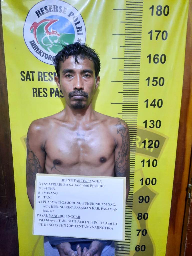 Kapolres Pasbar, AKBP Sugeng Hariyadi melalui Kasatresnarkoba, Iptu Eri Yanto mengatakan, penangkapan tersebut dari informasi masyarakat bahwa tersangka Syafriandi menanam ganja di kediamannya. Informasi itu selanjutnya didalami hingga dilakukan penangkapan.