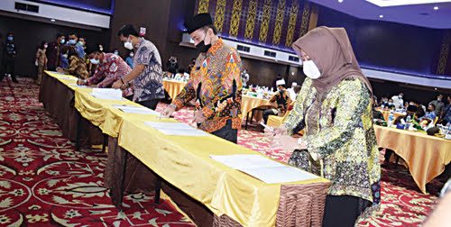 TANDA TANGAN— Sejumlah kepala daerah melakukan penandatanganan kesepahaman bersama dan perjanjian kerja saat peluncuran aplikasi E-Perda Rancak oleh Kanwil Kemenkumham Sumbar, kemarin.