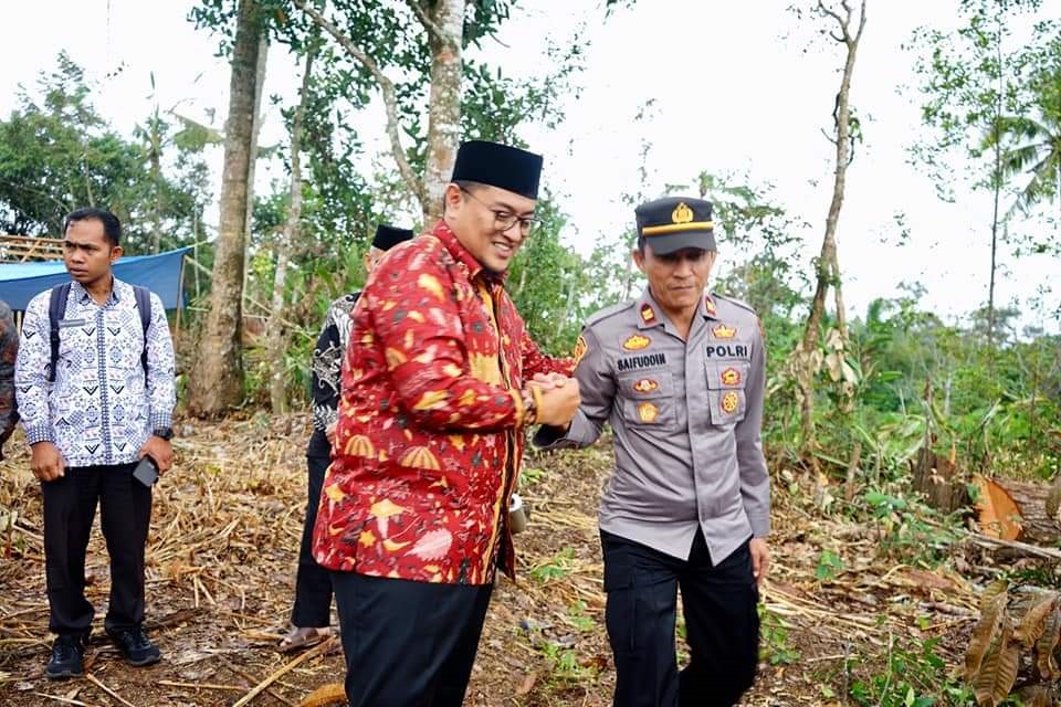 SALAMAN—Wabup Richi Aprian bersalaman dengan Kapolsek Rambatan Iptu Saipudin saat meninjau lokasi pembangunan ponpes.