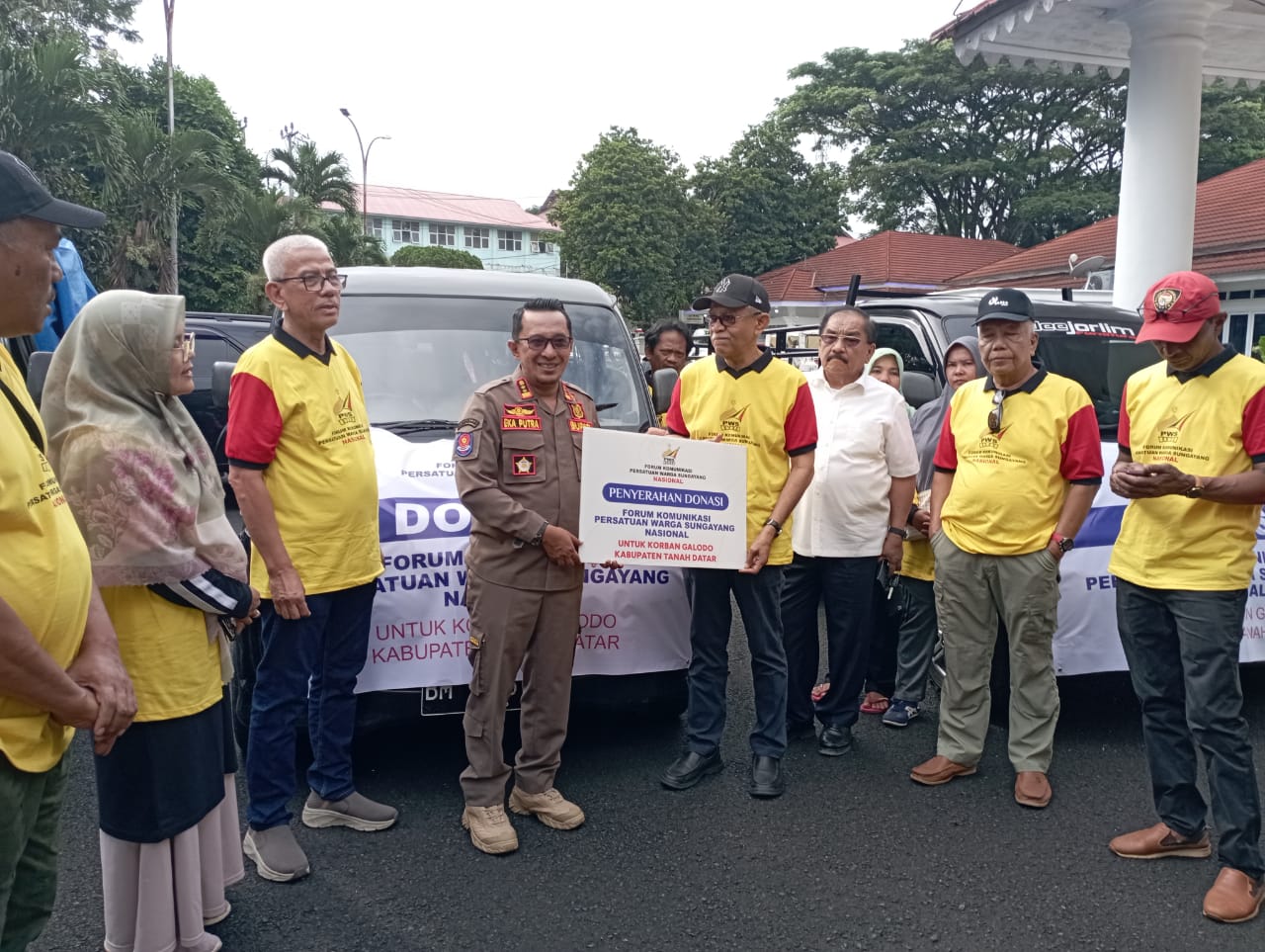 TANAHDATAR, METRO–Forum Kumunikasi Persatuan Warga Sungayang Nasional (FKPWSN) serahkan donasi untuk korban bencana lahar dingin dan banjir bandang marapi, Kabupaten Tanahdatar, Minggu (26/5).