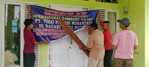PESSEL, METRO— Puluhan warga Nagari Koto Rawang, Kecamatan IV Jurai, Kabupaten Pesisir Selatan, menggelar aksi demonstrasi di depan kantor Wali Nagari, menuntut penolakan terhadap operasional tambang galian C yang dikelola PT Tigo Padusi Nusantara.