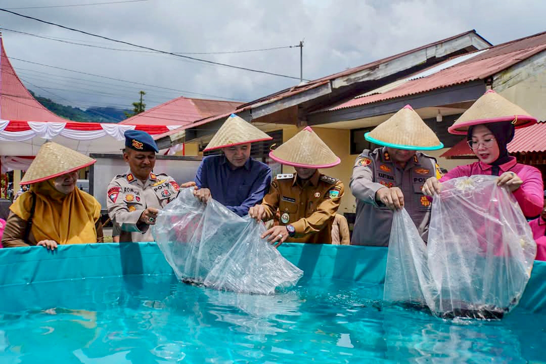 Kapolres Padang Panjang, AKBP Kartyana Widyarso Wardoyo Putro, SIK, MAP bersama Wakil Wali Kota, Allex Saputra dan Ketua DPRD, Imbral, S.E secara simbolis melakukan pelepasan bibit ikan nila, penanaman jahe, bayam, bawang perai, serta panen tanaman hidroponik yang dikembangkan di pekarangan Polsek.