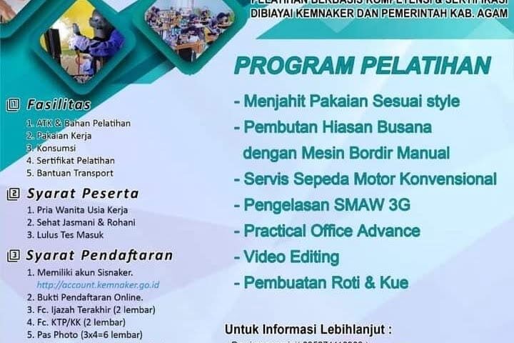Dinas PMPTSP Naker Kabupaten Agam terus berupaya mencetak tenaga kerja terampil. Melalui Unit Pelaksana Teknis Balai Latihan Kerja (UPT BLK) Kabupaten Agam, membuka lagi pendaftaran pelatihan untuk 7 kejuruan awal tahun ini dengan batas pendaftaran sampai 29 Januari 2021.