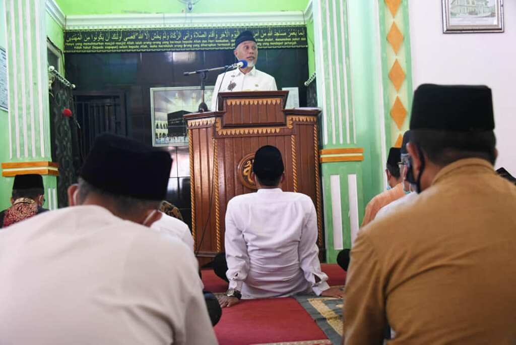 Wali Kota Padang, H. Mahyeldi Ansharullah menjadi khatib shalat Jumat di Masjid Nurul Huda, Korong Gadang, Kecamatan Kuranji, Kota Padang, Jumat (15/1). Mahyeldi menekankan pentingnya menanamkan keimanan kepada generasi muda sebagai calon pemimpin bangsa.