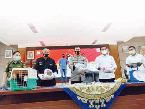 Kombes Pol Satake Bayu menjelaskan, barang bukti yang disita di antaranya dua ekor owa ungko dan satu ekor kinoy hingga satu ekor cucak ranting. Selanjutnya terdapat 32 ekor satwa jenis cucak hijau. Tiga jenis satwa dilindungi ini didapat dari penangkapan tersangka dalam keadaan hidup.