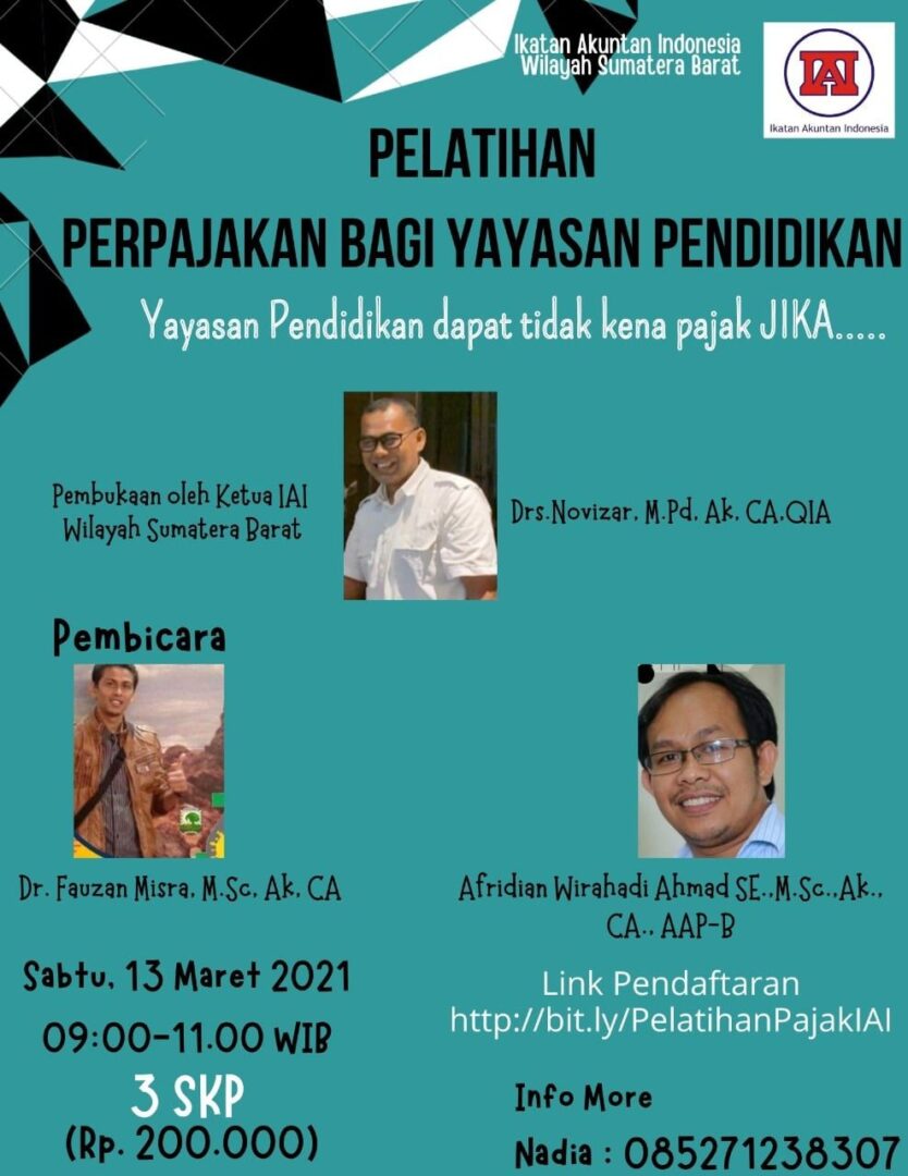 Ikatan Akuntan Indonesia (IAI) wilayah Sumatera Barat kembali menyelenggarakan pelatihan perpajakan bagi yayasan pendidikan. Pelatihan kali ini bertemakan “Yayasan Pendidikan dapat tidak kena pajak JIKA…”.