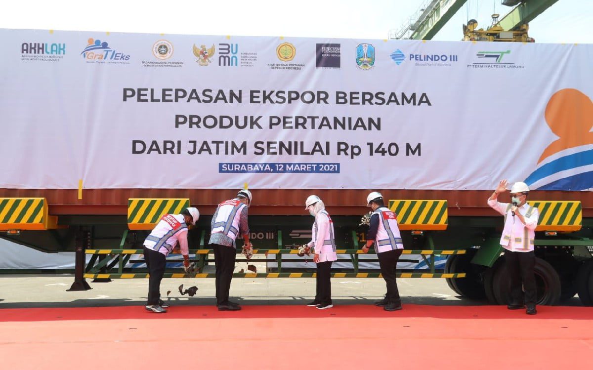 Menteri Pertanian (Mentan) Syahrul Yasin Limpo bersama Menteri Perdagangan (Mendag) Muhammad Lutfi, dan Menteri Badan Usaha Milik Negara (BUMN) Erick Thohir melepas ekspor produk pertanian asal Provinsi Jawa Timur (Jatim) bernilai Rp 140 miliar.