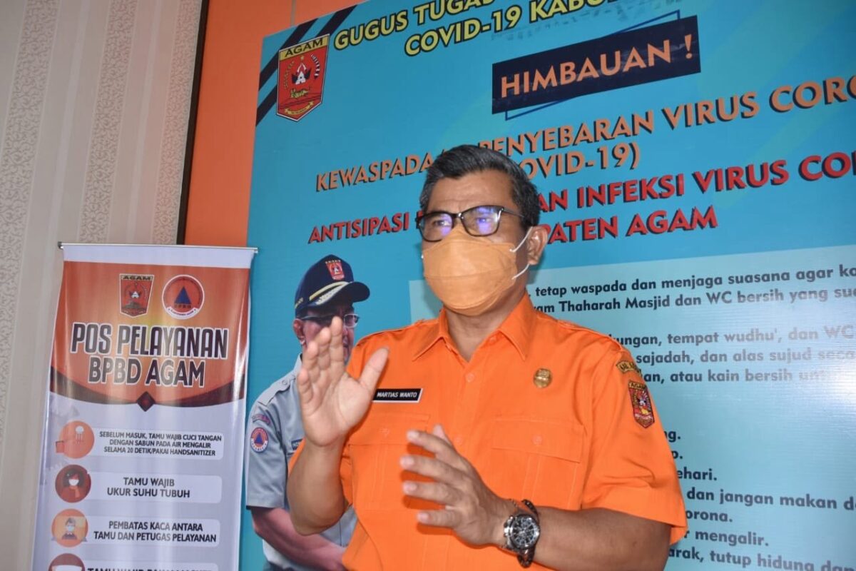 TINGKAT KESEMBUHAN— Ketua Harian Satuan Tugas Penanganan Covid-19 Agam, Drs Martias Wanto Dt Maruhun klaim kesembuhan pasien Covid 19 mencapai 4,34 persen.