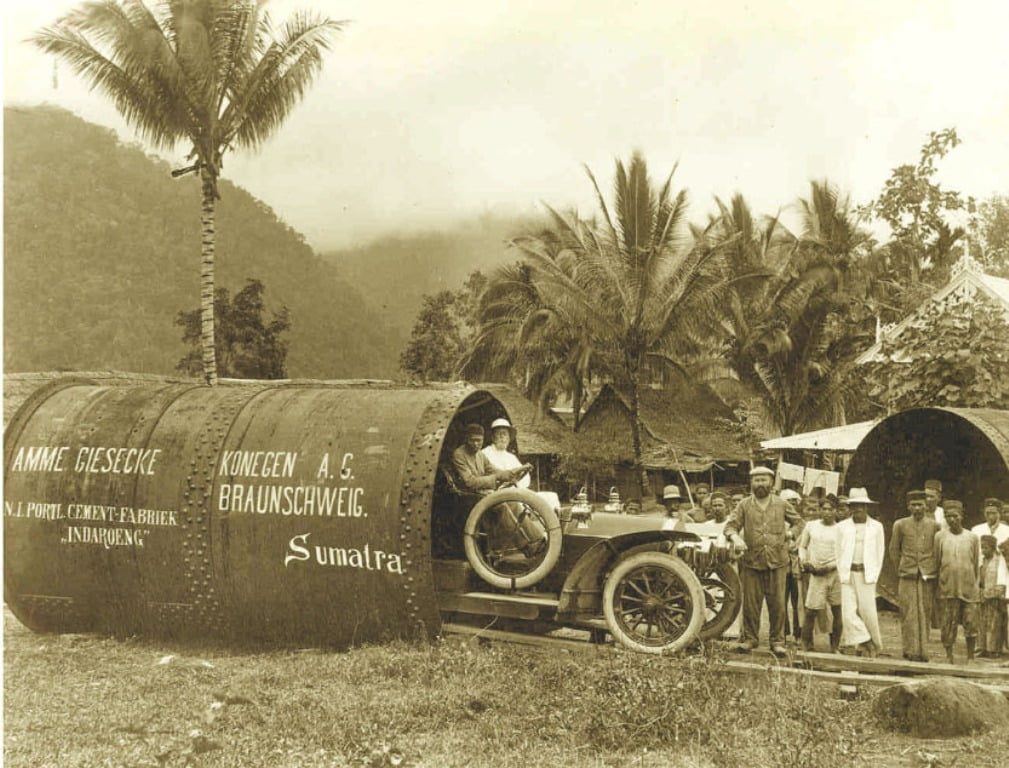 BERSEJARAH— Sebuah truk yang mengangkut kiln milik  NV Nerderlandsche Indische Portland Maatschappij, kini bernama PT Semen Padang, berhenti di sebuah tempat teduh. Ada tiga orang yang berdiri di depan truk yang menuju kawasan Indarung tersebut. Itulah foto bersejarah, cikal bakal berdirinya PT Semen Padang yang kini berusia 111 tahun.