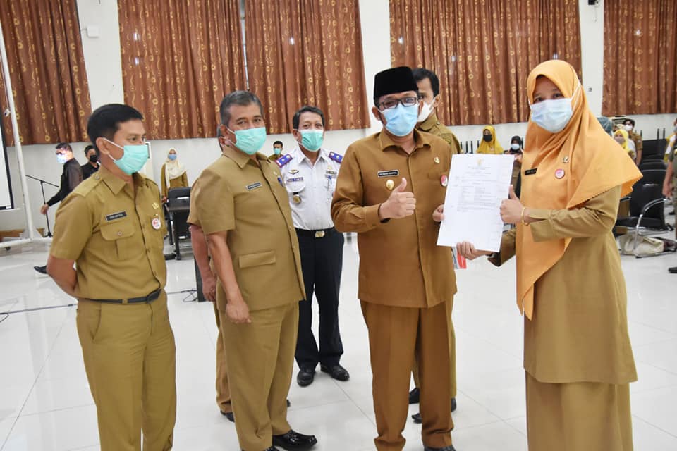 “Dari 623 orang tersebut, pada hari ini kita serahkan sebanyak 122 orang untuk golongan IV.a dan IV.b, terdiri dari jabatan struktural sebanyak 21 PNS, jabatan fungsional guru sebanyak 87 PNS, tenaga medis dan angka kredit lainnya sebanyak 10 PNS, fungsional umum sebanyak 3 PNS, sedangkan 1 orang tidak memenuhi syarat.