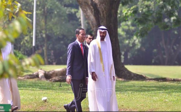 Presiden Joko Widodo bersama putra mahkota Abu Dhabi Sheikh Mohamed Bin Zayed Al-nahyan berjalan di halaman belakang istana bogor.