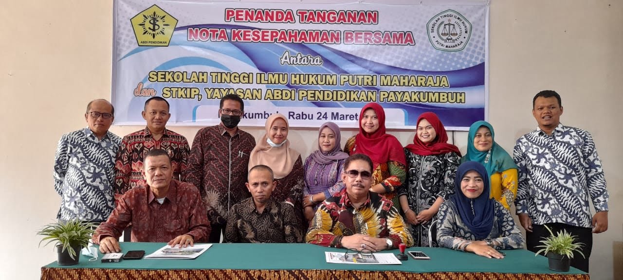 Bertempat di Kampus STIH Putri Maharaja Payakumbuh di Jalan Inai, Koto Nan Ampek, Belakang SPBU/Pengadilan Agama Payakumbuh, pada Rabu pagi (24/3) telah dilaksanakan penanda tanganan MoU (Memorandum of Understanding) atau Nota Kesepahaman Bersama antara pihak Sekolah Tinggi Ilmu Hukum (STIH) Putri Maharaja Payakumbuh dengan pihak Sekolah Tinggi Keguruan dan Ilmu Pendidikan (STKIP) Abdi Pendidikan Payakumbuh secara offline (luring).