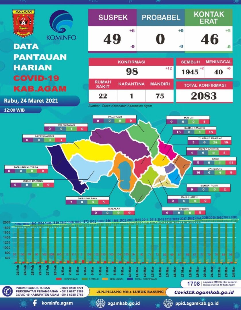 Ketua Harian Satuan Tugas Penanganan Covid-19 Kabupaten Agam, Drs. Martias Wanto Dt. Maruhun kembali menginformasikan update data terbaru Covid-19. Rabu (24/3) ini sebanyak 12 warga Kabupaten Agam dilaporkan terkonfirmasi Covid-19. Sementara pasien yang dinyatakan sembuh dari Covid-19 bertambah 2 orang.