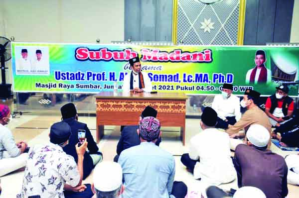 Kedatangan ustaz yang biasa disapa UAS ini di Padang dalam rangka tabliqh akbar dan Launching Subuh Madani. Dalam ceramahnya, UAS menyampaikan pemimpin yang bertaqwa dan memakmurkan masjid dengan cara mendirikan bangunan indah dan shalat berjamaah di masjid.