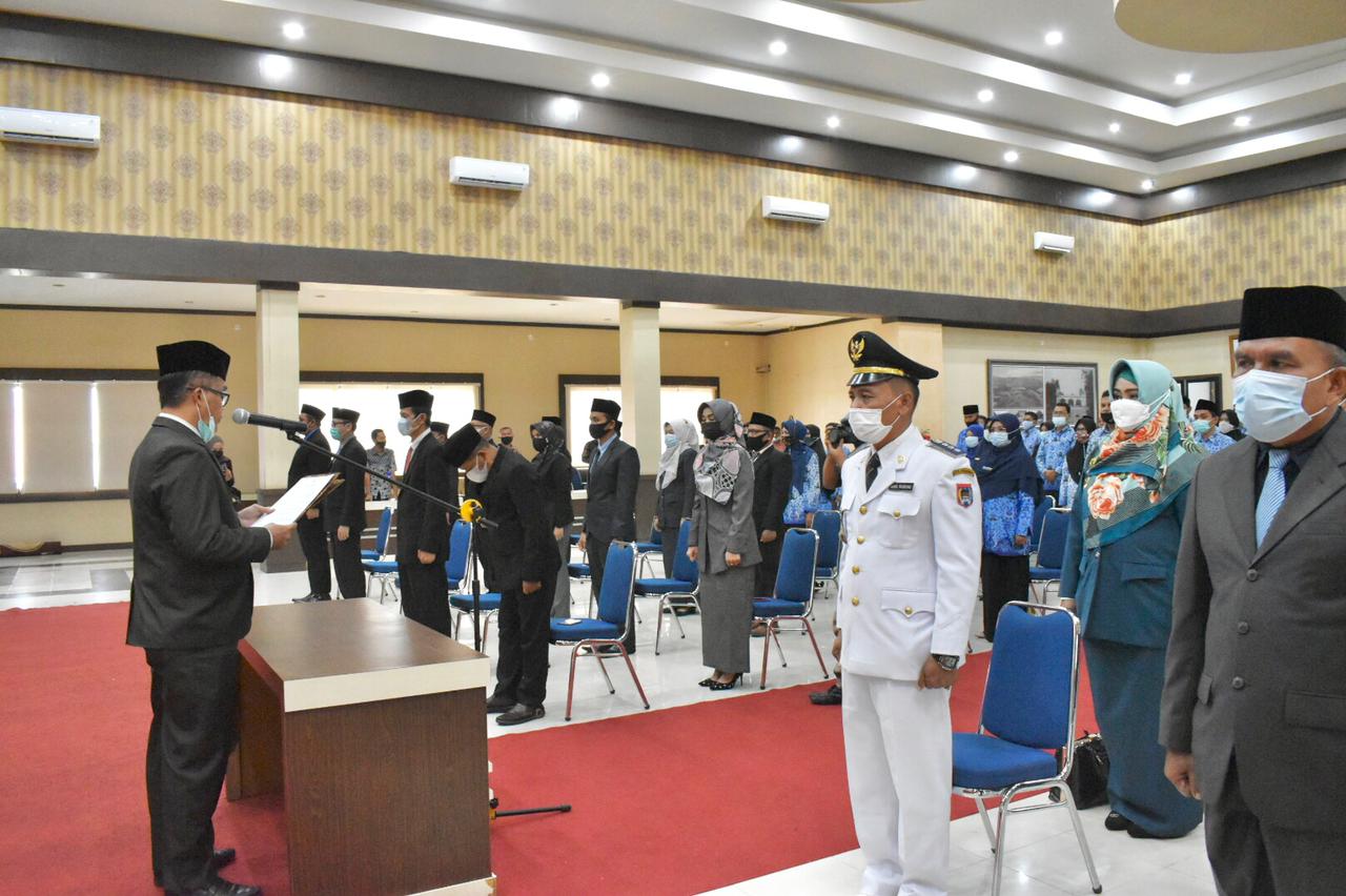 Sebanyak 105 aparatur sipil negara (ASN) di lingkungan Pemerintah Kota Payakumbuh dilantik dan diambil sumpah jabatannya oleh Wali Kota Riza Falepi diwakili Sekretaris Daerah Rida Ananda di Aula Ngalau Indah, Lantai III Balaikota Payakumbuh, Kamis (25/3). Pelantikan yang juga disaksikan Asisten I Yufnani Away dan Kepala BKPSDM Yasrial itu dilaksanakan kepada sebanyak 3 orang pejabat eselon II, 25 pejabat eselon III, 49 pejabat eselon IV, dan 28 pejabat fungsional.