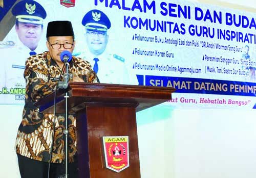 Guna mewujudkan sumber daya manusia (SDM) yang berkualitas, perlu dibangun budaya literasi di kalangan pendidik dan siswa. Pesan itu disampaikan Bupati Agam Andri Warman saat menghadiri acara peluncuran buku “Antologi Puisi dan Esai Dr. H. Andri Warman Sang Guru” di Balairung Rang Agam Lubuk Basung, Rabu malam (24/3).