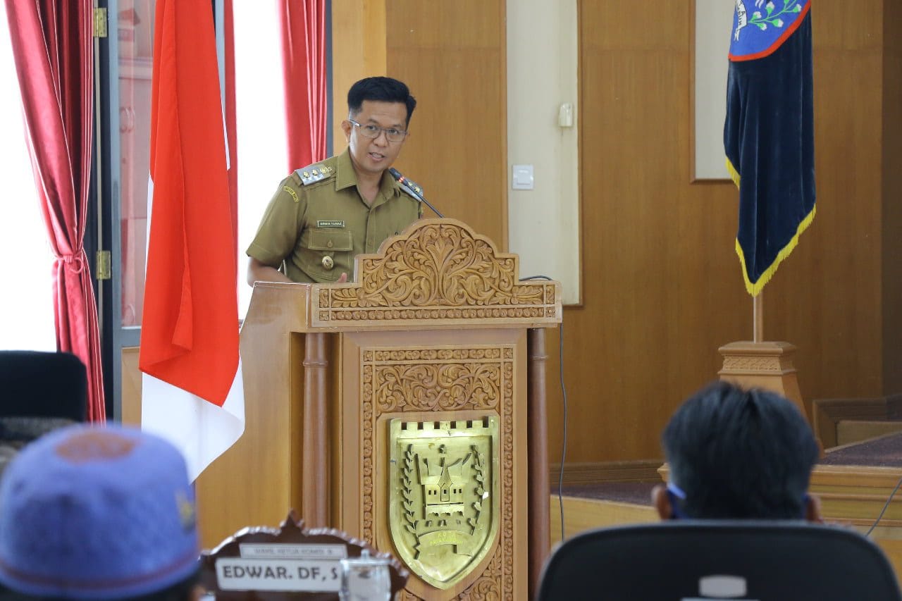 BACAKAN NOTA PENJELASAN— Wakil Wali Kota Payakumbuh H Erwin Yunaz membacakan nota pejelasan Wali Kota Payakumbuh atas LKPj Tahun 2020 di ruang sidang DPRD Kota Payakumbuh.