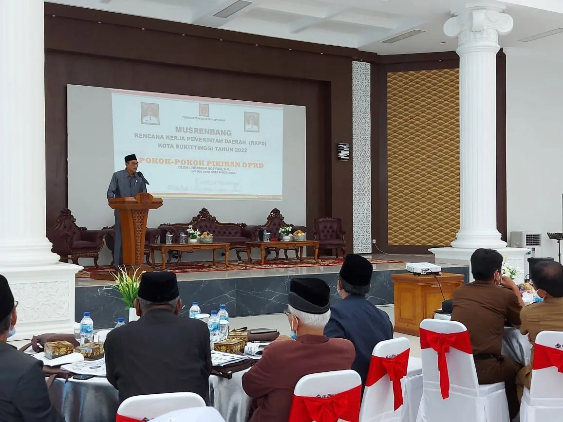 Ketua DPRD Bukittinggi, Herman Sofyan, memaparkan sejumlah pokok pikiran DPRD Bukittinggi tahun 2022. Pemaparan pokir itu, disampaikan dalam Musrenbang RKPD Kota Bukittinggi tahun 2022, di Balairung rumah dinas wali kota,baru-baru ini Herman Sofyan menjelaskan, pokok pikiran, merupakan saran dari Anggota DPRD yang merupakan hasil reses yang dilaksanakan. Pokir menjadi dokumen penting yang berasal dari berbagai masukan konstituen. Diantara usulan yang disampaikan, terkait peningkatan kualitas sumber daya manusia, peningkatkan kualitas kinerja pemerintah, peningkatan pemerataan ekonomi, meningkatkan pertumbuhan ekonomi yang ramah lingkungan.
