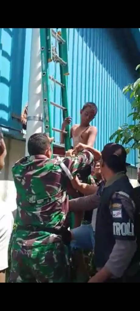 Untuk menghindari kemarahan warga, sejumlah anggota TNI dan Polisi yang tiba di lokasi mencoba membujuknya dengan memberikan tangga untuk turun ke bawah. “Ayo turun, kamu aman, tidak akan dipukuli,” Bujuk salah seorang anggota TNI.