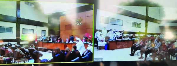 MEMANAS—Suasana persidangan Habib Rizieq yang memanas terlihat dari layar yang disediakan di depan Pengadilan Negeri Jakarta Timur, Kamis (22/ 4/ 2021)