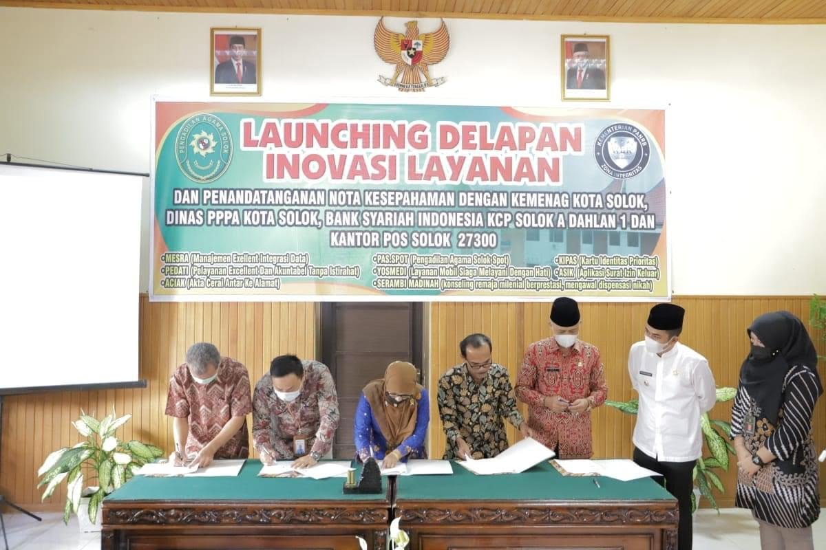 TANDA TANGAN— Wakil Kota Solok Rahmadhani Kirana Putra bersama Pengadilan Agama menandatangani delapan inovasi layanan.
