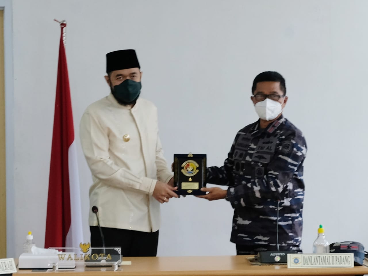 SERAHKAN—Danlantamal II Laksamana Pertama TNI Hargianto, S.E., M.M., M.Si (Han) serahkan cendera mata pada Wako Fadly Amran, BBA, Datuk Paduka Malano.