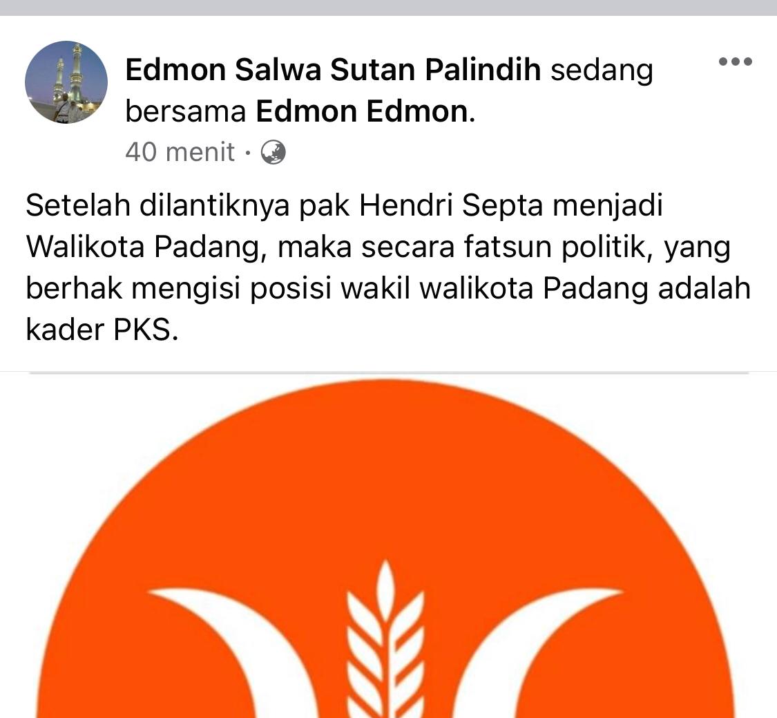 Edmon menulis. “Setelah dilantiknya pak Hendri Septa menjadi Walikota Padang, maka secara fatsun politik, yang berhak mengisi posisi wakil walikota Padang adalah kader PKS.”