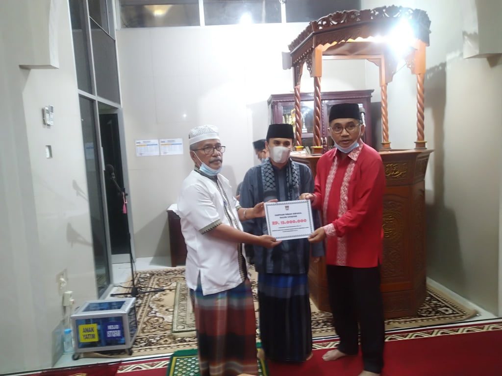 Dalam kesempatan safari Ramadhan 1442 Hijriah/2021 Masehi. Anggota DPRD Kota Padang, Mastilizal Aye menyerahkan secara simbolis bantuan sebesar 15 juta untuk membantu pembangunan masjid. (hen)