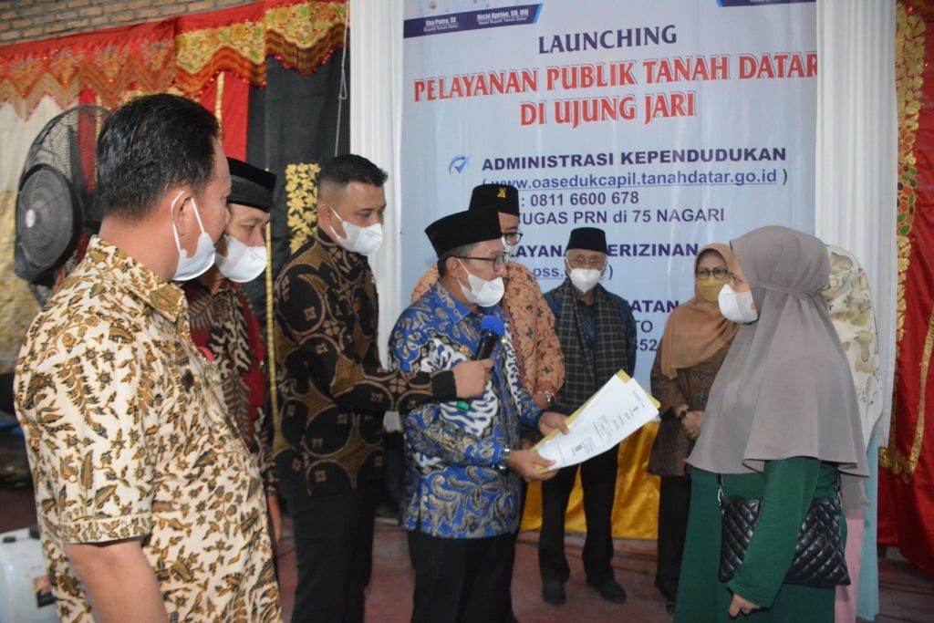 TERANGKAN—Bupati Tanahdatar Eka Putra menerangkan cara pelayanan pada masyarakat saat acara kemarin.