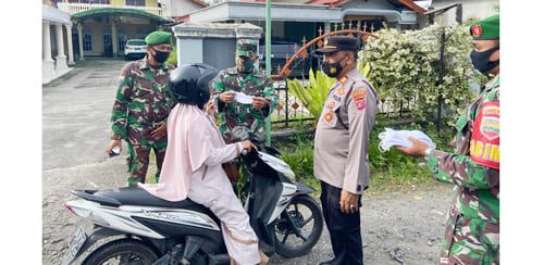 BAGIKAN MASKER— Plh Danramil 03/Sungai Sariak Letda Inf Syahrul bersama Kapolsek AKP Hepi Kusnadi bagikan masker kepada pengguna jalan.