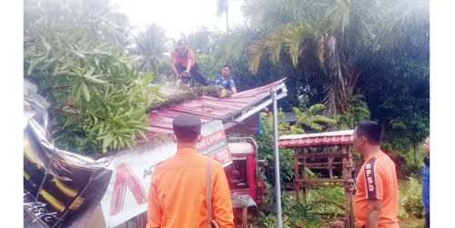 TIMPA RUMAH— Pohon tumbang di Jorong Balai Satu, Nagari Malalak Selatan, Kecamatan Malalak menimpa atap rumah milik Dedi Akmal (48).
