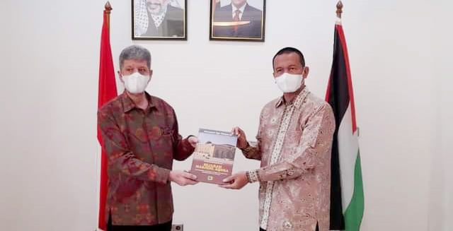 SERAHKAN BANTUAN—Wako Genius Umar serahkan bantuan Palestina kepada Dubes Palestina untuk Indonesia Zuhair S.M. Alshun, di Kantor Kedubes Palestina yang beralamat di Menteng, Kecamatan Menteng, Kota Jakarta Pusat.