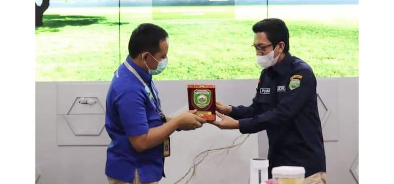 Kepala Dinas Kependudukan dan Pencatatan Sipil Padangpariaman M. Fadhly menerima cendramata dari Kepala Dinas Kependudukan dan Capil Sumatera Selatan Pu’adi.