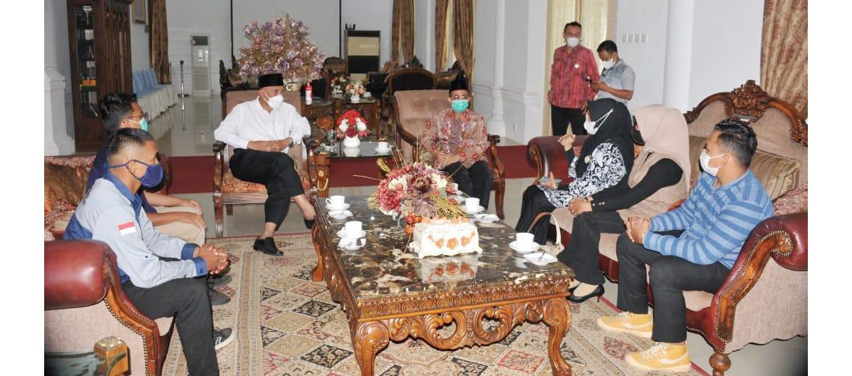 TERIMA—Gubernur Sumbar, Mahyeldi Ansharullah menerima lima orang utusan Sumbar yang ikut Pelayaran Muhibah Budaya, didampingi Kepala Dinas Kebudayaan, Gemala Ranti dan Kepala Balai Pelestarian Nilai Budaya Wilayah Sumbar, Undri di Istana Gubernuran, Kamis (1/7).