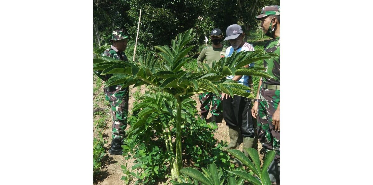 LIMAPULUH KOTA, METRO–Anggota Satgas TNI Manunggal Membangun Desa/ Nagari (TMMD/N) ke-111 tahun 2021 Kodim 0306/50 Kota menggali potensi budidaya porang, dengan mengunjungi perkebunan porang milik salah satu warga di Jorong Kampung Tangah, Nagari Talang Maur.
