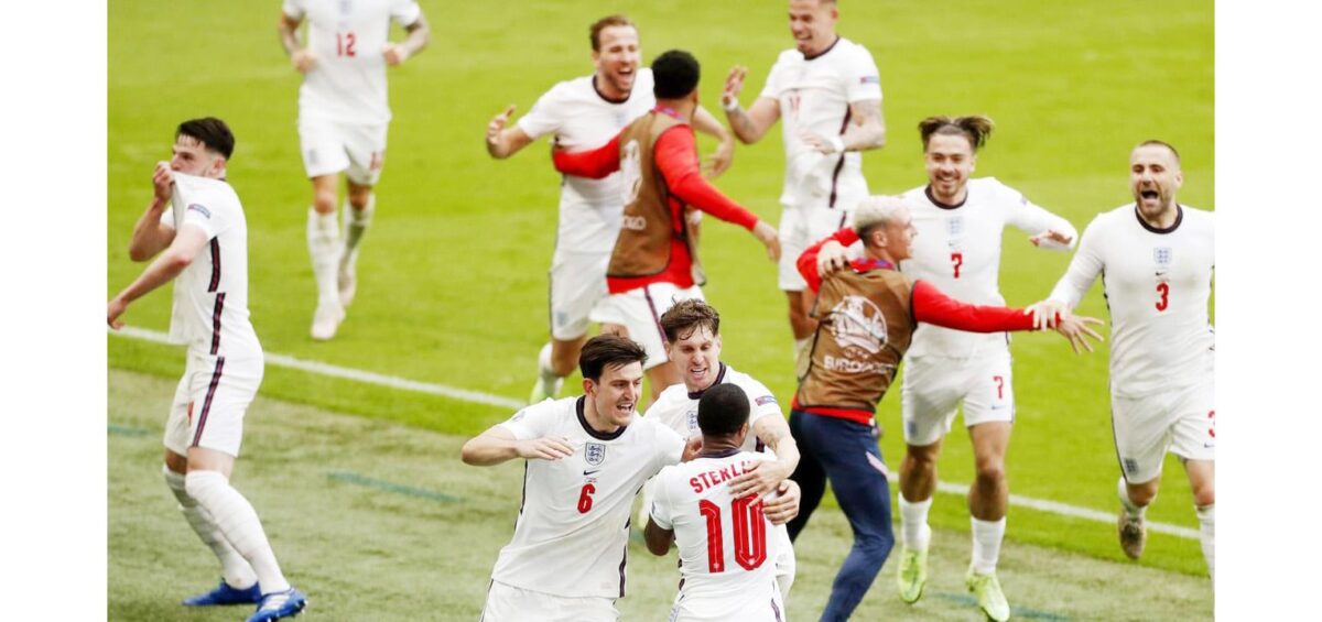 KEMENANGAN— Pemain Timnas Inggris tumpah ruah di lapangan saat merayakan gol yang dicetak Raheem Sterling gol ke gawang Jerman di babak 16 besar Euro 2020.