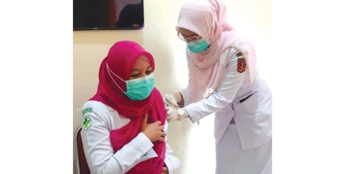 DISUNTIK VAKSIN— Seorang tenaga kesehatan disuntik vaksin Covid-19 di Puskesmas Sungai Pua.
